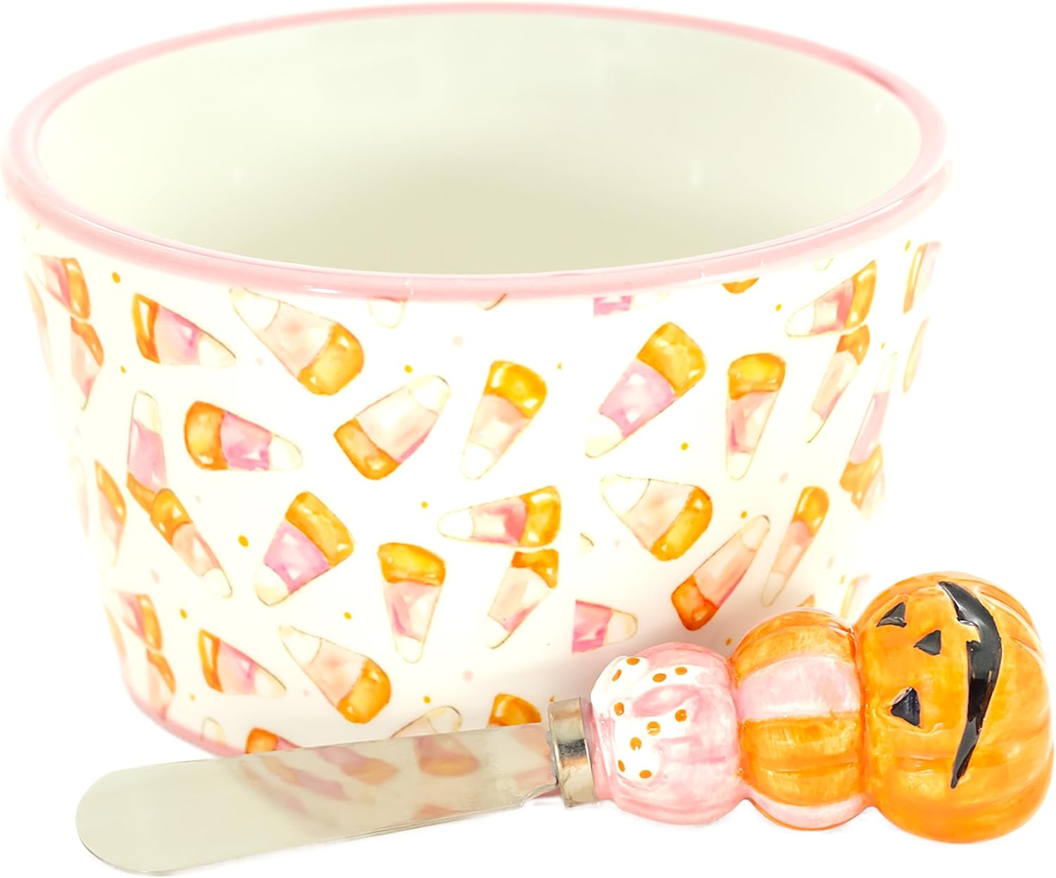- PINK CANDY CORN Bowl features a candy corn design, spreader handle is stack of pink and orange pumpkins