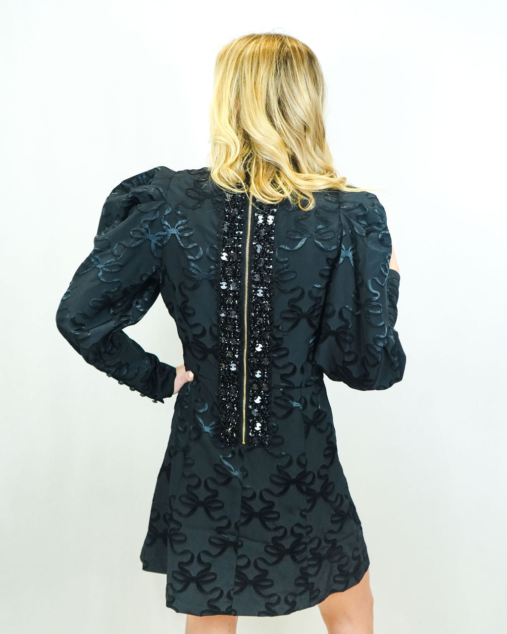 The Zoe Mini in Bow Lattice features a mock neckline and exposed back zip closure framed in monochrome jewel trim, and puff sleeves with tailored cuffs. Crafted in the bow lattice fabric, this mini brings depth and texture to a monochrome palette. With its sharp silhouette and refined embellishments, it’s a standout party-forward piece for the season.