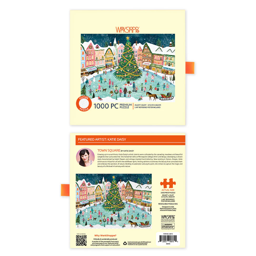 Lace up your skates and glide into a picture-perfect winter wonderland with the Town Square holiday puzzle. This delightful 1000-piece jigsaw puzzle for adults captures the joy of a snowy holiday evening, where twinkling shop windows, cheerful skaters, horse-drawn sleighs, and a grand Christmas tree bring the town to life.
