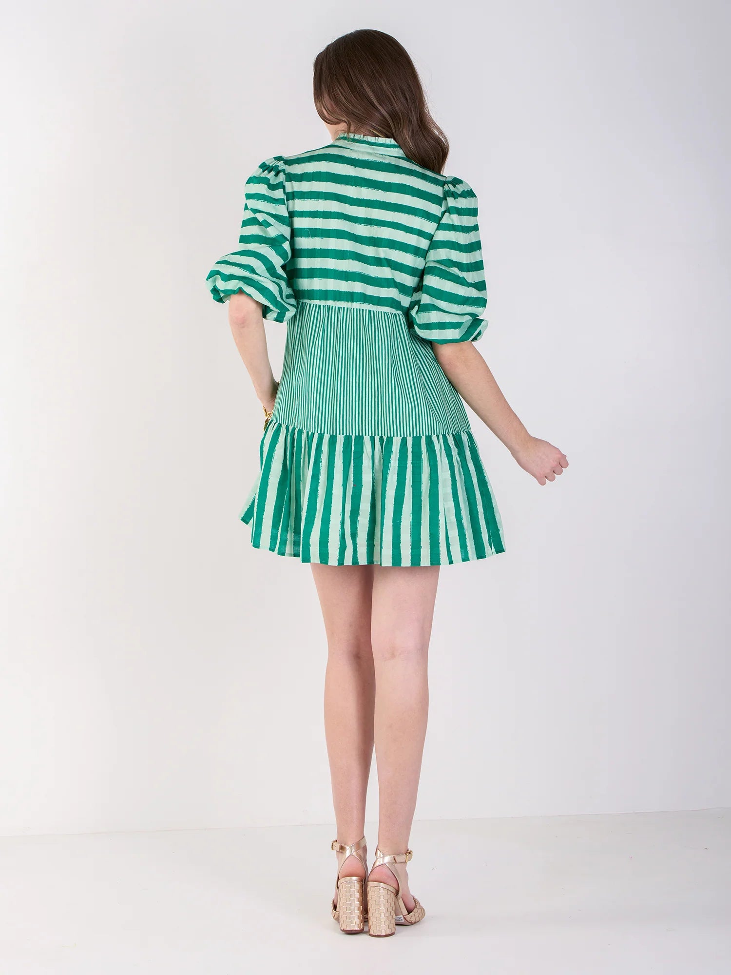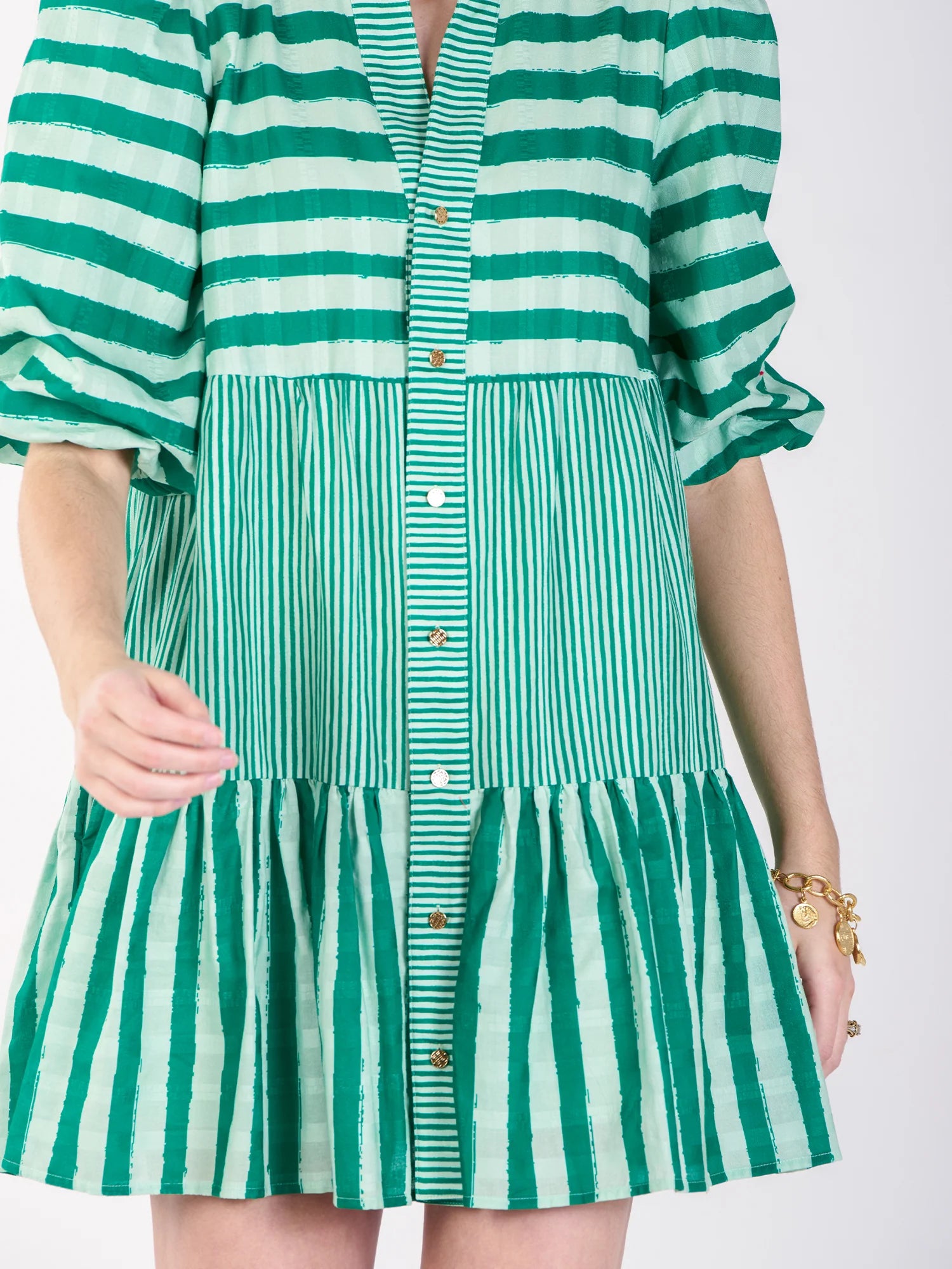 The Sadie Dress in Mist Green Stripe is an easy standout with playful detail and breathable comfort. Crafted in cool cotton jacquard, this silhouette offers subtle structure and effortless movement. It features a blouson sleeve, signature gold button front, and a loose, relaxed fit. Contrasted stripe tiers throughout the dress create visual dimension and a touch of unexpected charm. Perfect for warm days when you want to look polished yet feel completely at ease.