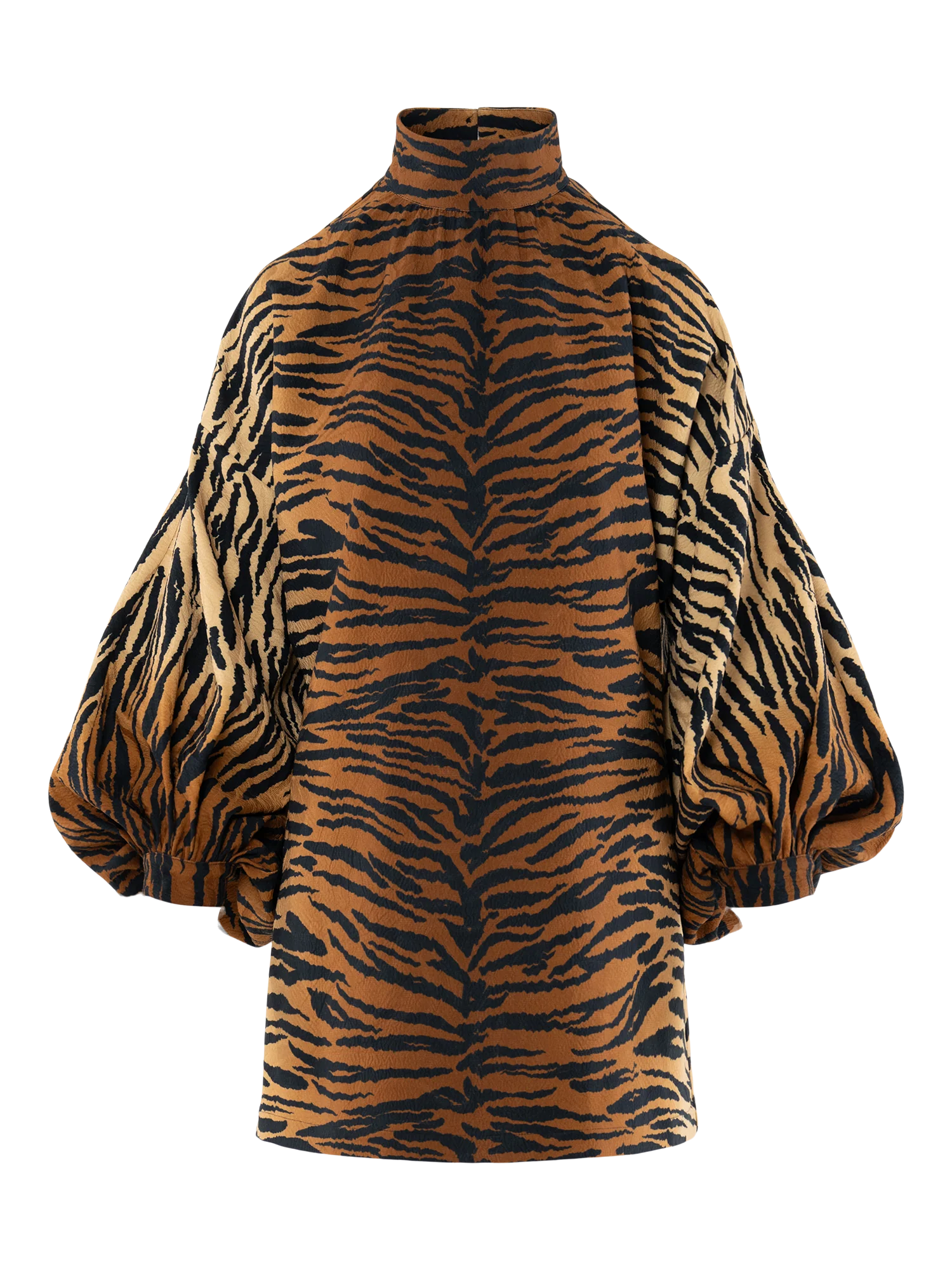 The Sasha Mini in Tiger Jacquard commands attention with its bold silhouette and statement sleeves. Featuring a structured mock neck and a loose-fitting mini shape, this style is defined by its dramatic full-length blouson sleeves. The rich, textural jacquard brings the tiger motif to life, offering a striking blend of sophistication and wild elegance.