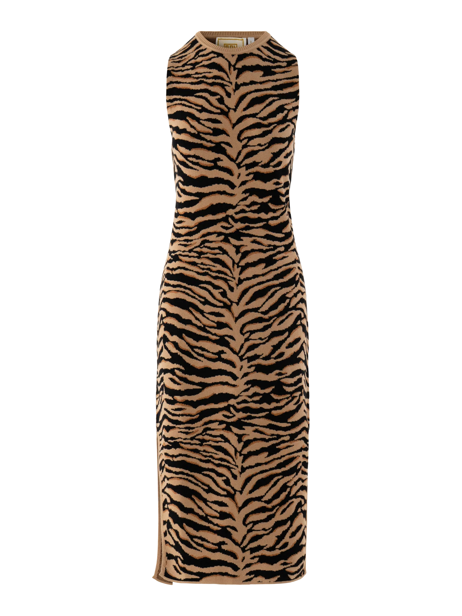The Simone Sweater Dress in Tiger is a sleek, curve-skimming sensation crafted in our best-selling viscose knit. Its streamlined silhouette makes it the ultimate chameleon—wear it solo for a bold statement or layer it effortlessly as the seasons shift. The fierce tiger print roars with vintage Italian glamour, striking the perfect balance between wild energy and refined elegance. Versatile, functional, and undeniably chic, this is the dress you’ll reach for time and again, no matter the occasion.