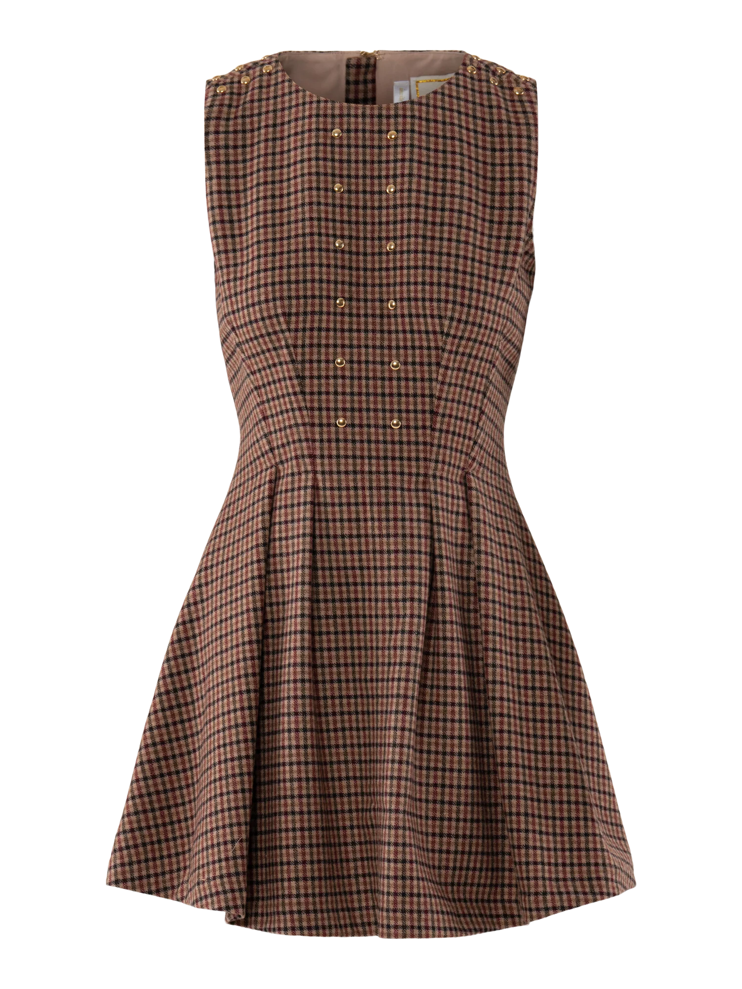 The Vivi Dress in Tweed brings playful charm to a tailored silhouette. Designed with a fitted bodice that flows into a flared skater-style skirt, this dress creates subtle volume for a flattering shape. The wool-blend tweed offers a timeless, heritage-inspired touch, while gold stud hardware at the bodice and shoulder seams highlights its polished detailing. An exposed gold zipper at the back, complete with our signature logo pull, adds a modern edge to this classic look.