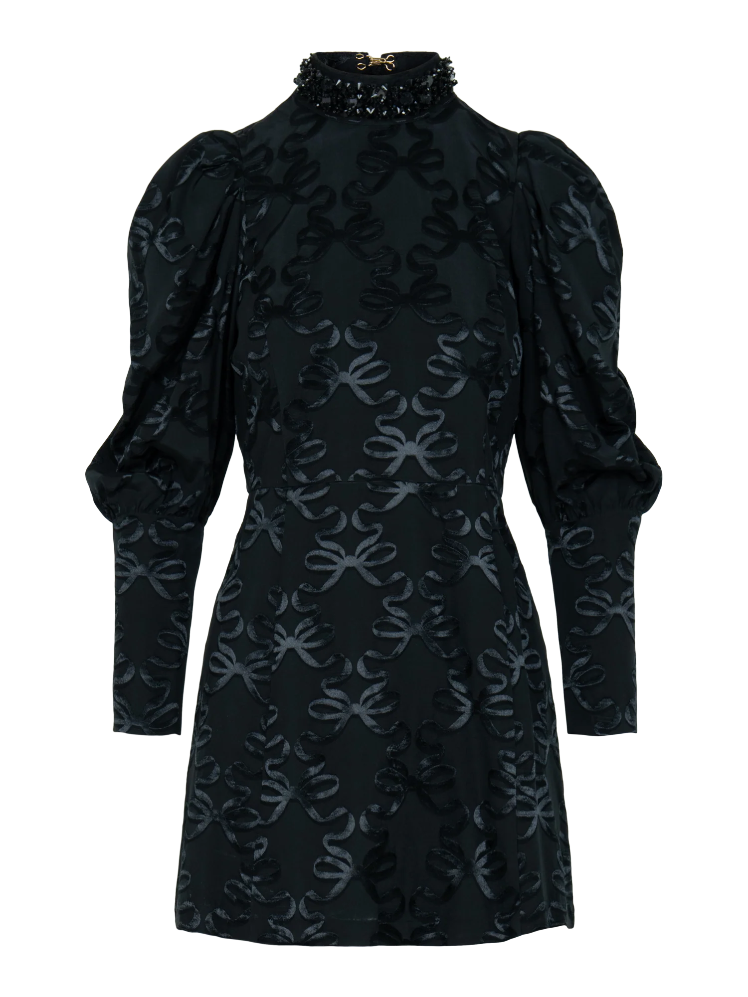 The Zoe Mini in Bow Lattice features a mock neckline and exposed back zip closure framed in monochrome jewel trim, and puff sleeves with tailored cuffs. Crafted in the bow lattice fabric, this mini brings depth and texture to a monochrome palette. With its sharp silhouette and refined embellishments, it’s a standout party-forward piece for the season.