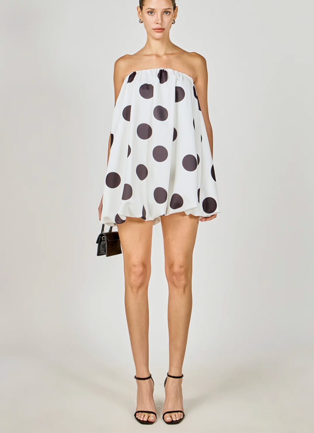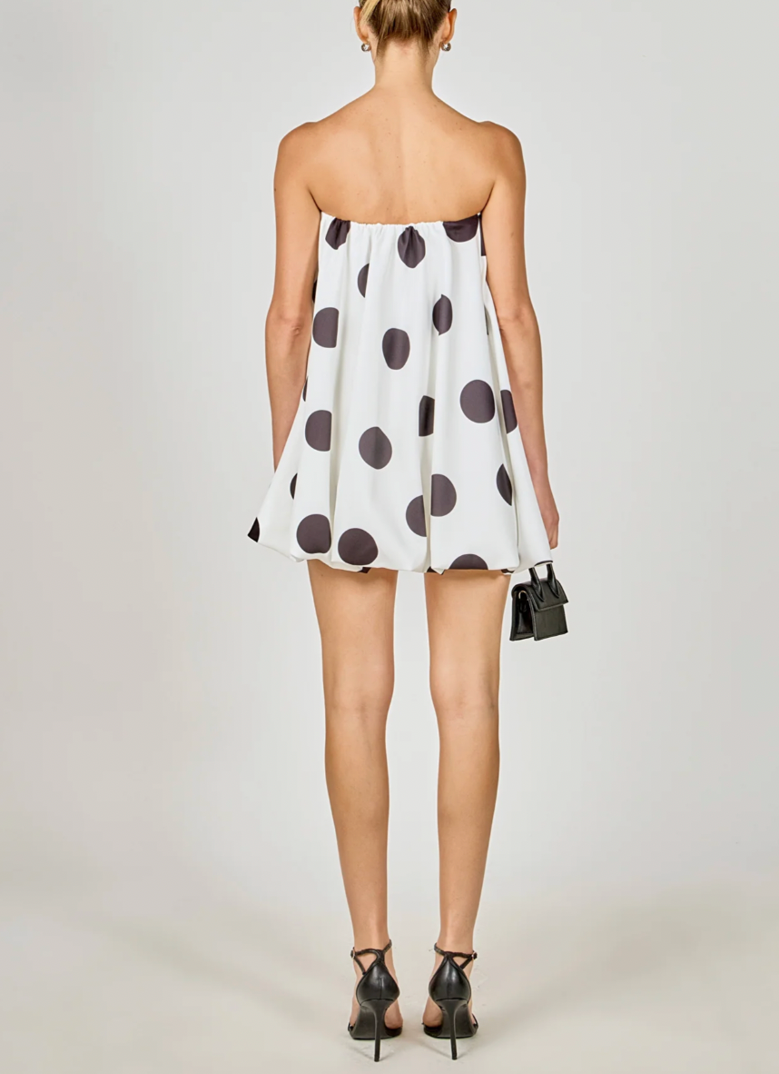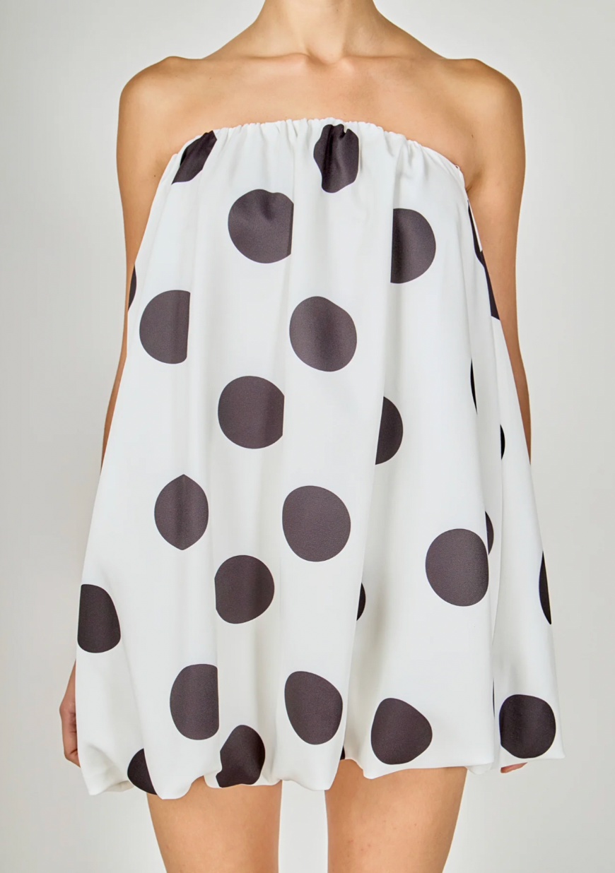 Polka Dot Bubble Mini Dress! Adorable and feminine, this dress features a playful polka dot print that is on-trend and will make you stand out in a crowd. The bubble hem adds a fun and flirty touch, while the mini length is perfect for showing off your legs. Made from a lightweight material, this dress is comfortable and breathable, making it perfect for any occasion. With its flattering silhouette and unique design, this dress is a must-have for any fashion-forward woman.