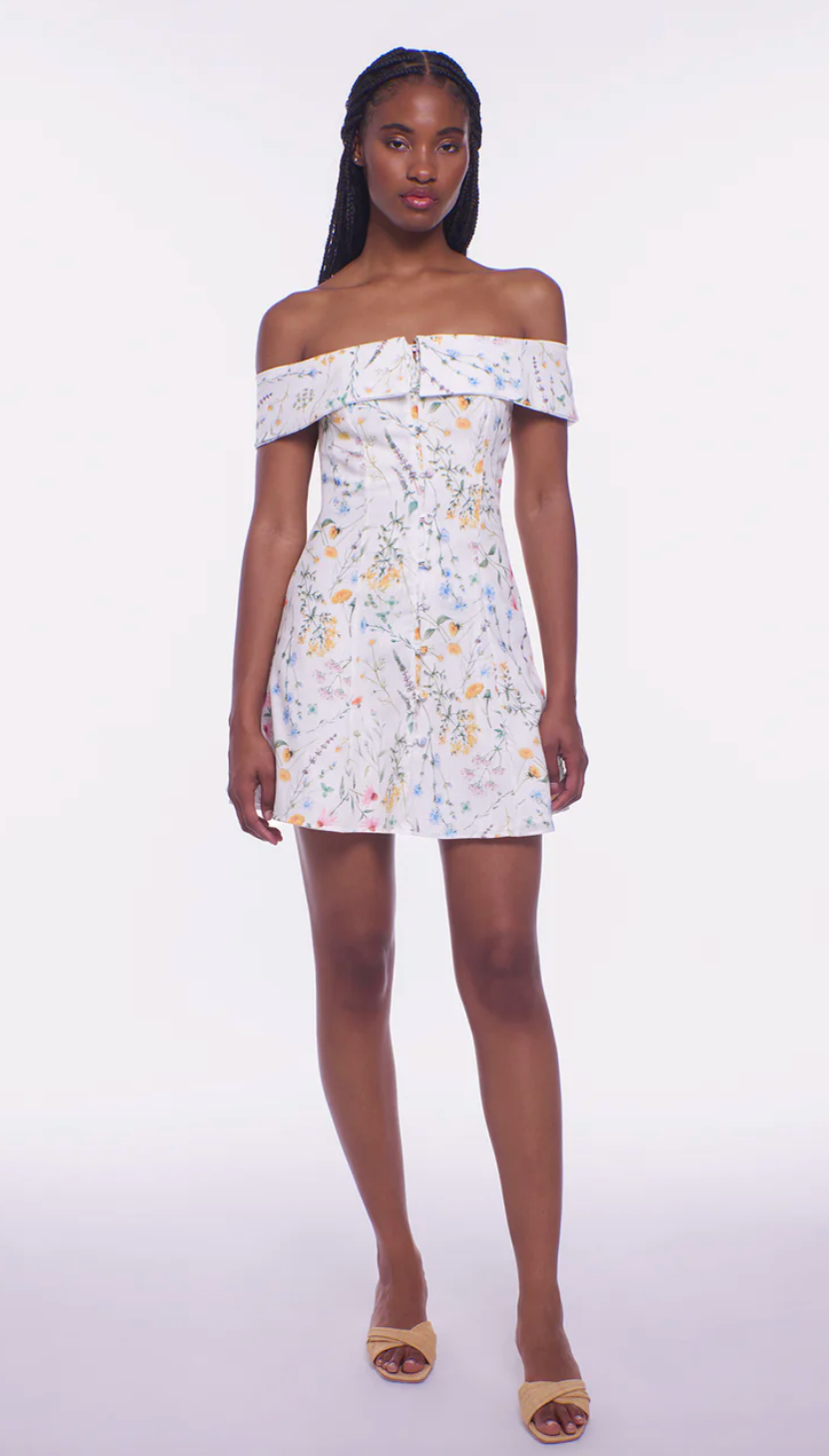 Softly structured and endlessly feminine, the Adeline Dress is reimagined in our Wildflower print, a dainty floral that feels light and romantic. Designed with an elegant off the shoulder neckline and a graceful row of covered buttons, the silhouette gently skims the body for a flattering, polished fit. The delicate floral adds a fresh, spring ready charm while the clean lines keep it refined and effortless. Perfect for brunch dates, garden parties, and everything in between, Adeline is the kind of piece that feels both timeless and unforgettable.