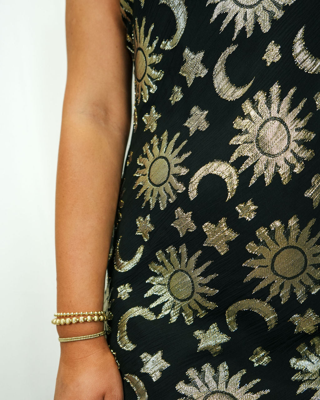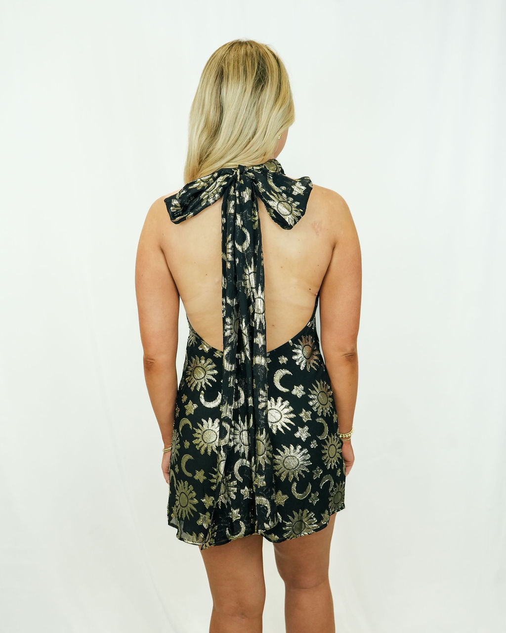 She's here! Our bestselling maxi is now available in a mini length! The Lisa Mini stuns with a chic halter neckline, fluttery scarf tie, and dramatic open back, all finished with an eye catching celestial print. It’s the new must-have for every special event on your calendar!