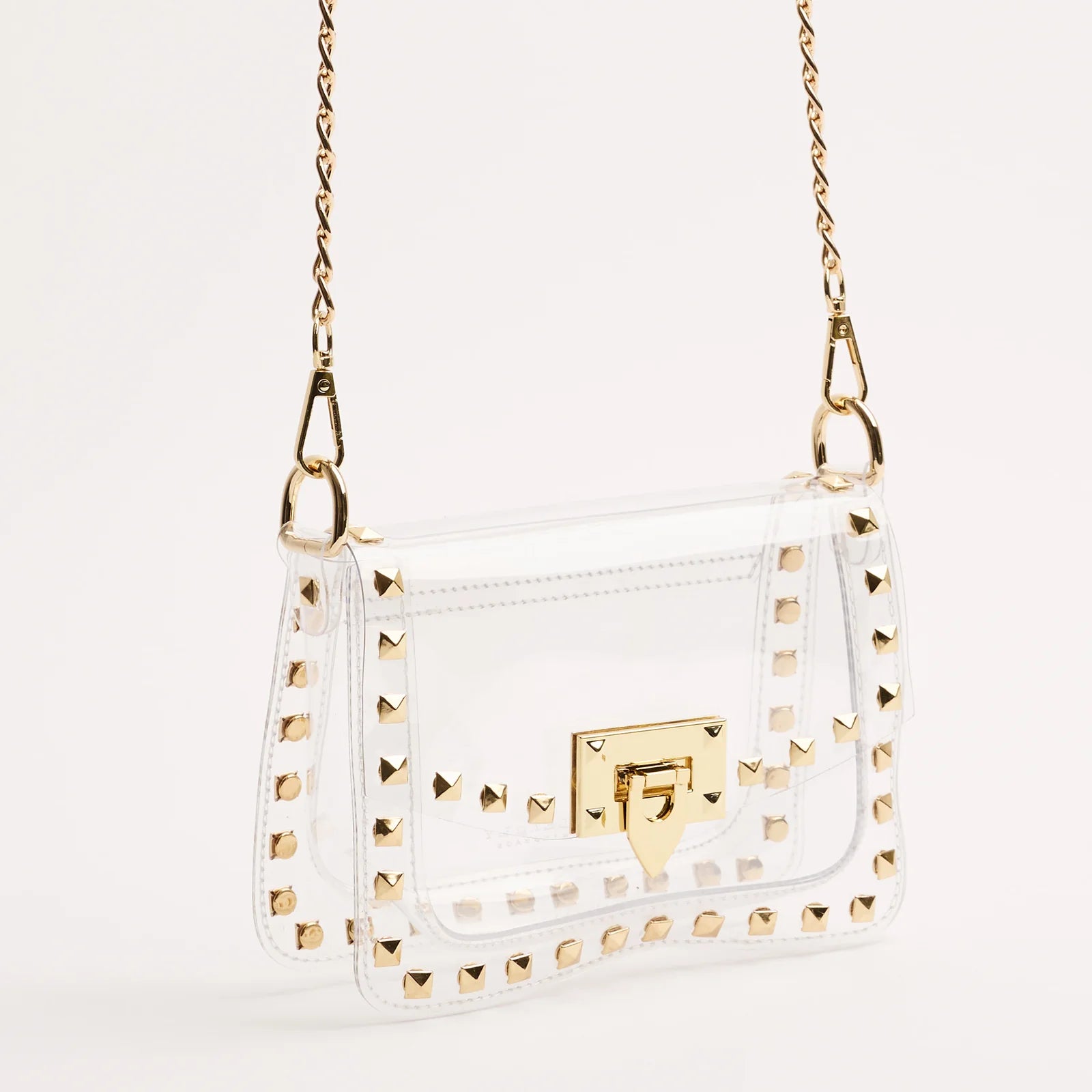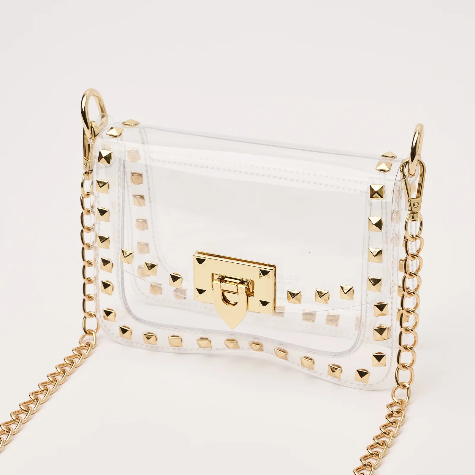 Score with the biggest winner in our clear handbag playbook - The Jackie! The Jackie changed the handbag game by proving clear handbags could be both functional and chic. This style includes gold square metal studs and a gold chain. The Jackie is NCAA and NFL compliant and the ideal size to hold your wallet, phone, keys, lip gloss and a few other small items.