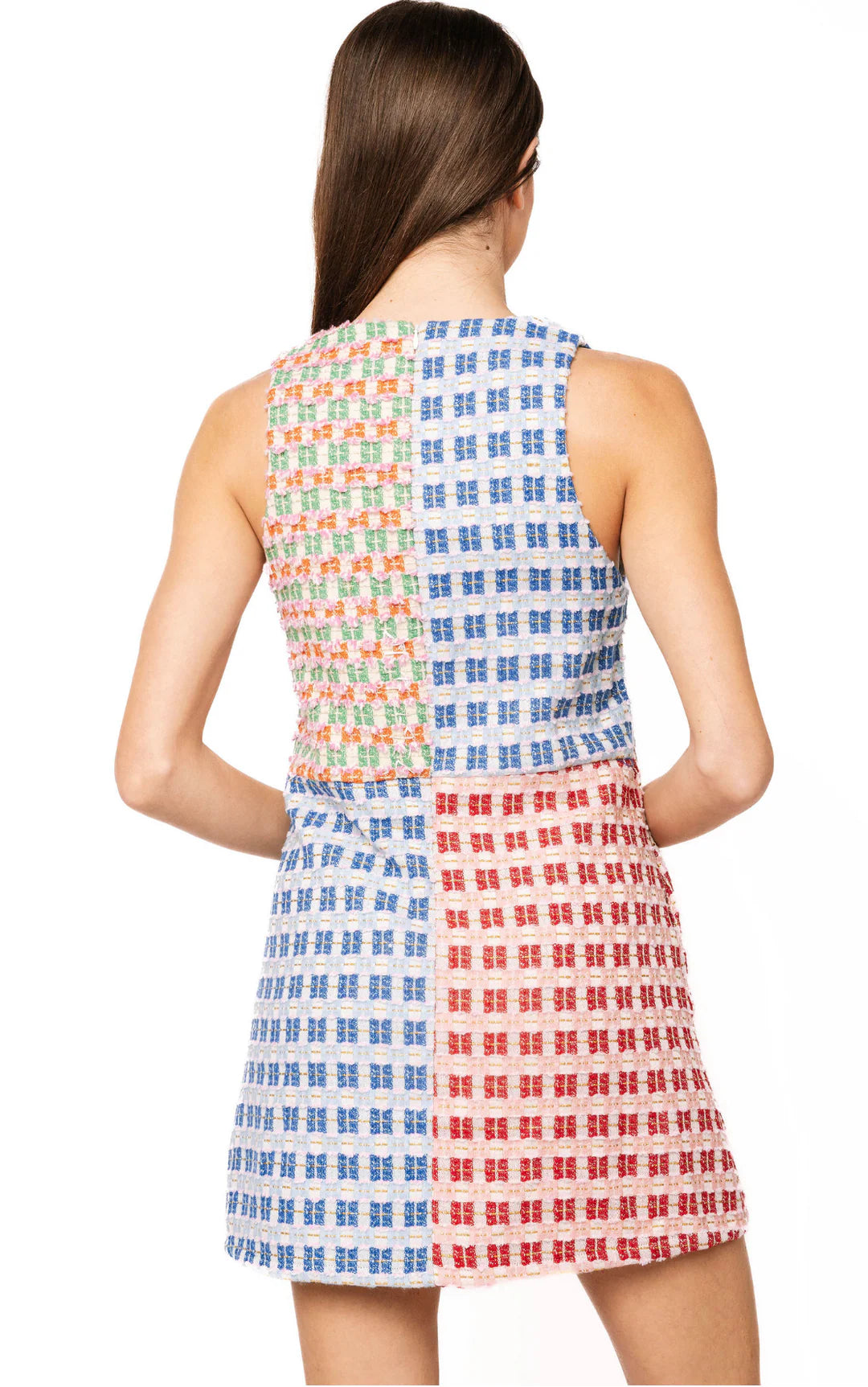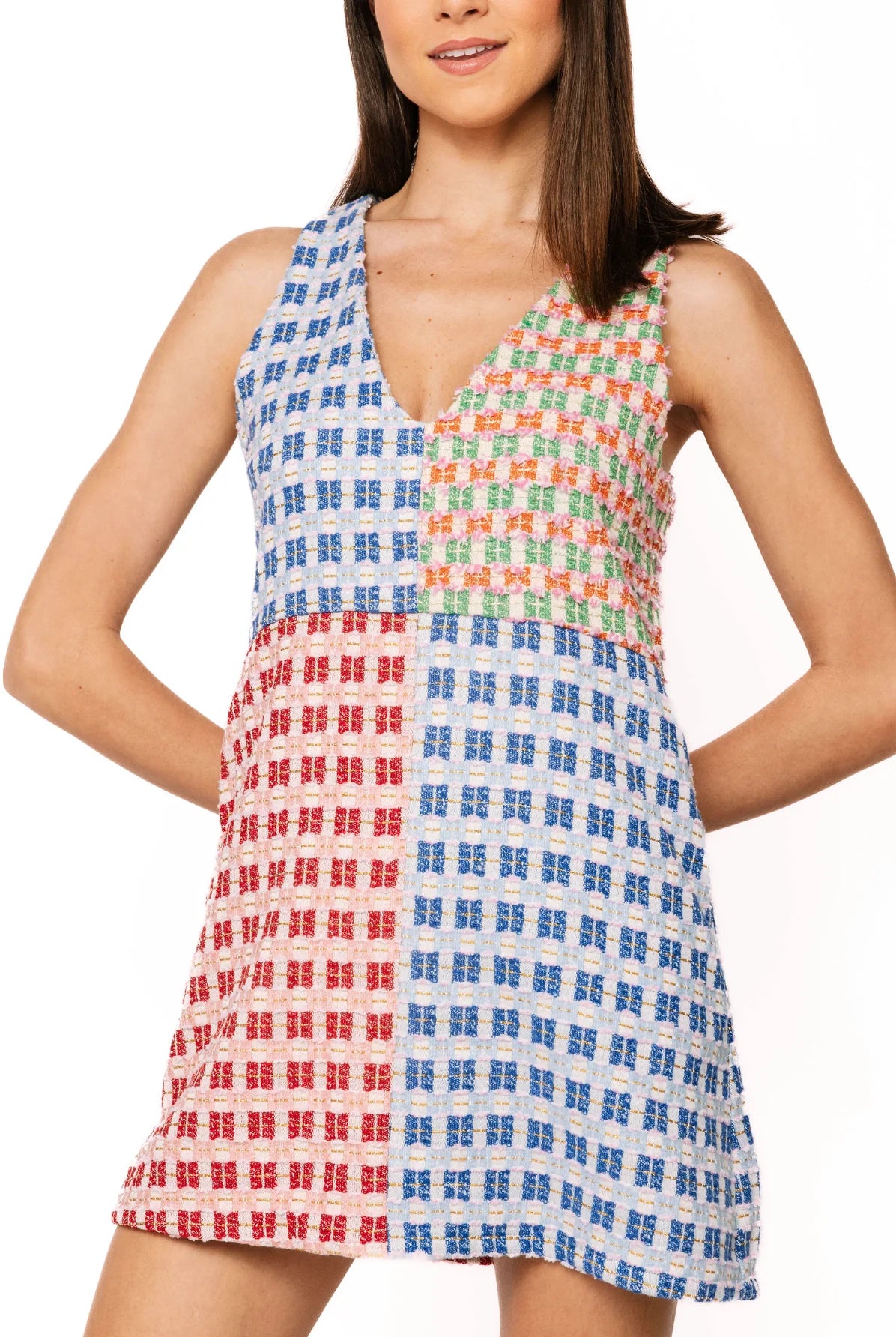 - The Queen of Sparkles Colorblock Tweed V-Neck Tank Dress features a chic colorblock tweed design with a flattering V-neckline. This dress combines classic elegance with playful color and signature sparkle detailing—perfect for dressing up any occasion