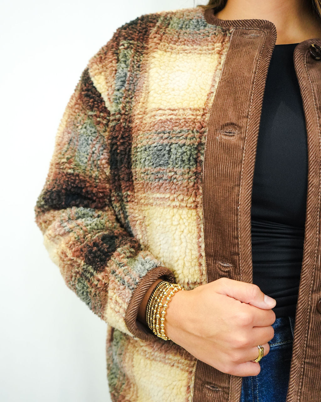 The RD STYLE Sophie Sherpa Jacket is your go-to for those in-between days! Cozy sherpa, cool plaid, and fun corduroy touches make it warm and stylish. With buttons and pockets, it’s perfect for layering and staying comfy all season long.