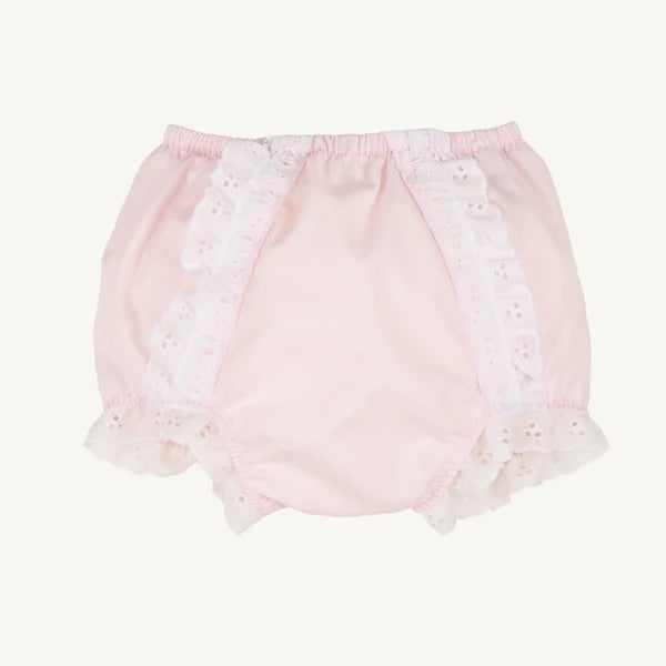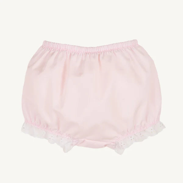 Belle's Bloomers in Palm Beach Pink with Worth Avenue White Eyelet are a wardrobe staple that works beautifully on their own or layered under her favorite T.B.B.C. dresses and outfits. These classic bloomers feature delicate eyelet trim that adds a touch of sweetness to every ensemble. A versatile essential that's perfect for playtime, portraits and everything in between!