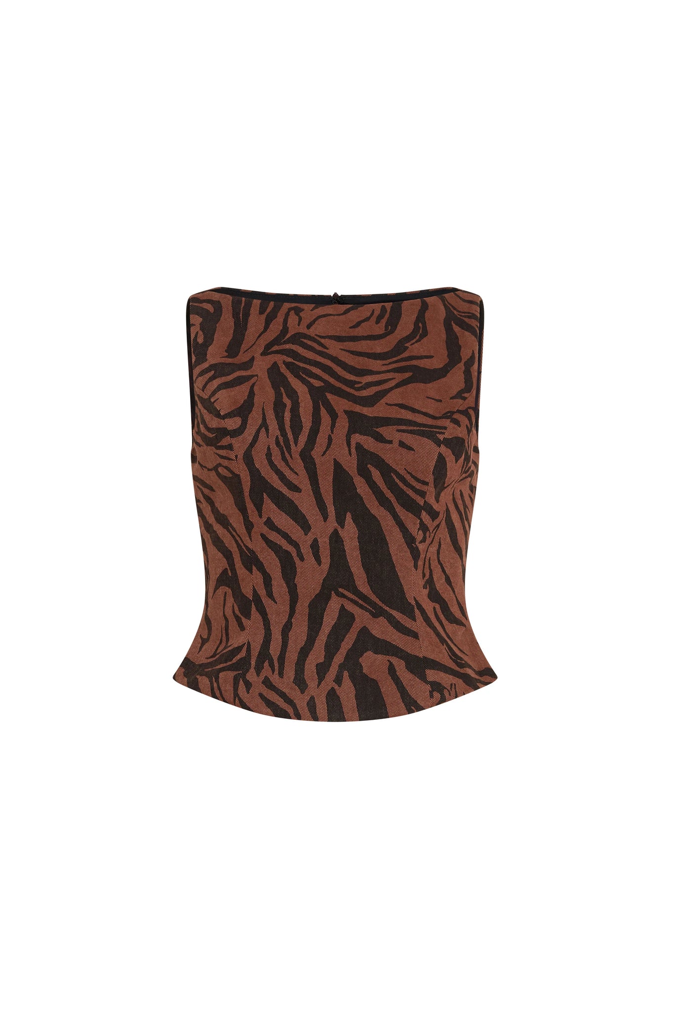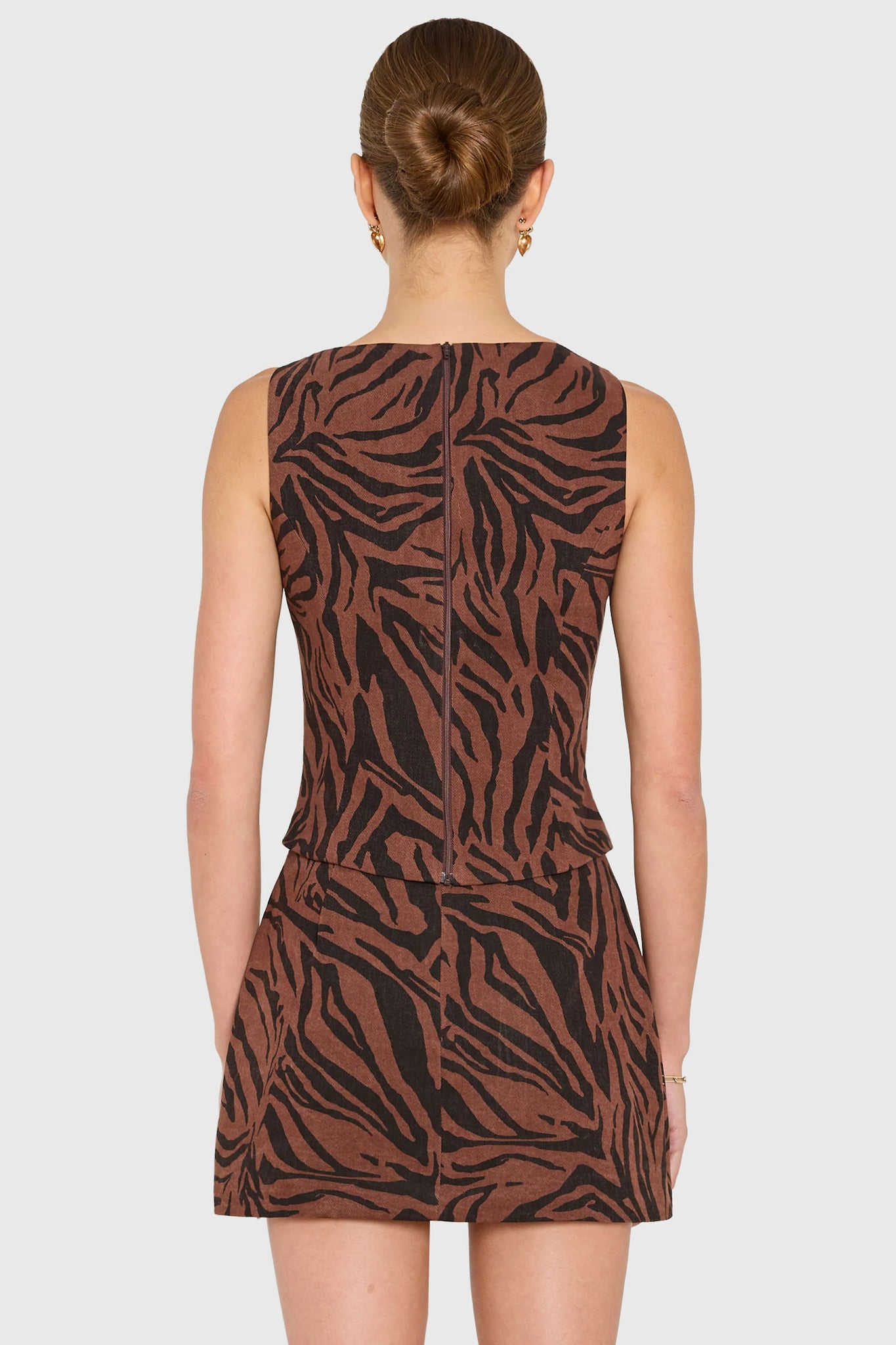 Add a touch of edge in the Ines Top. This structured tank features a soft boatneck and rounded hem, which contrast perfectly against the bold animal print. Pair with the Miles Skort for a matching moment, or with your favorite high-waisted jeans for a crisp going out-outfit.