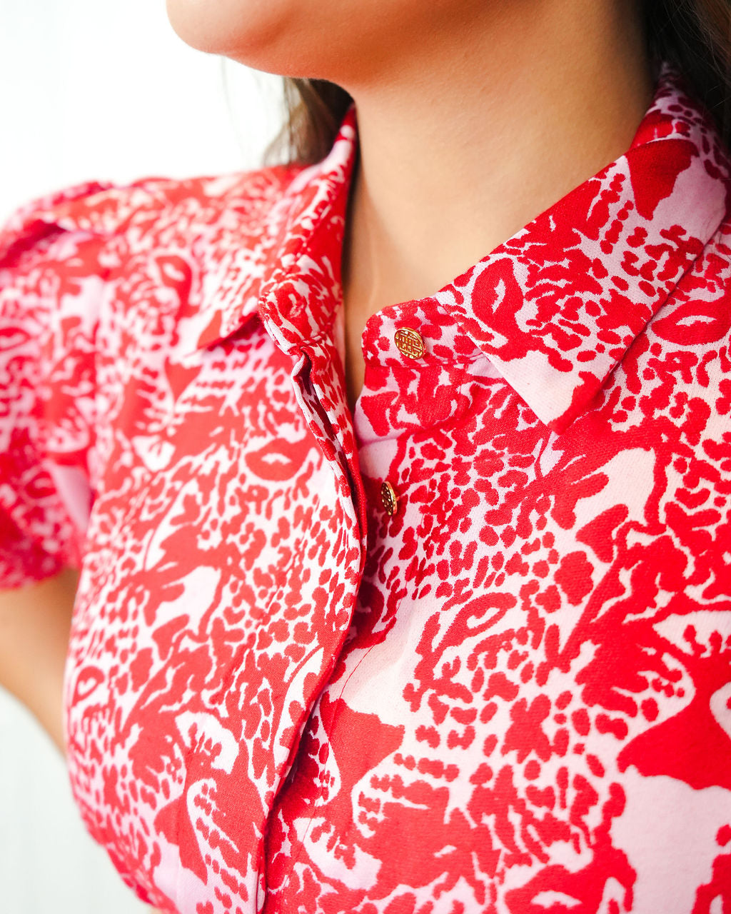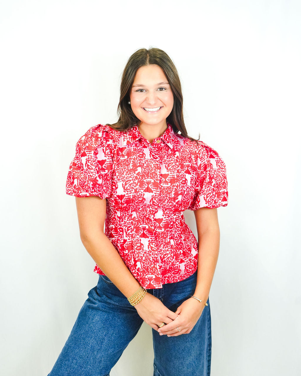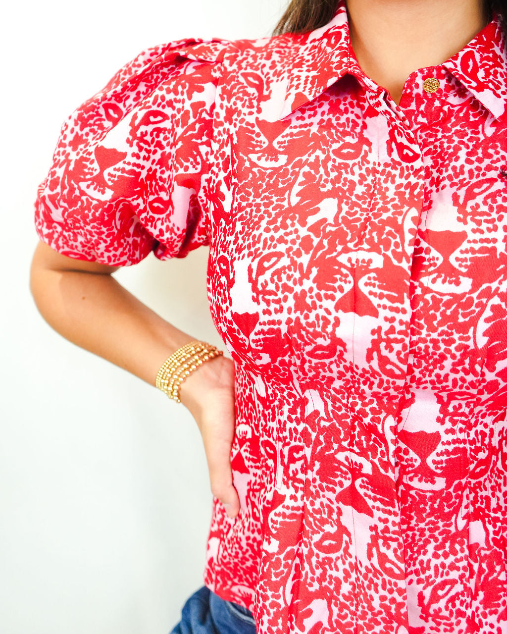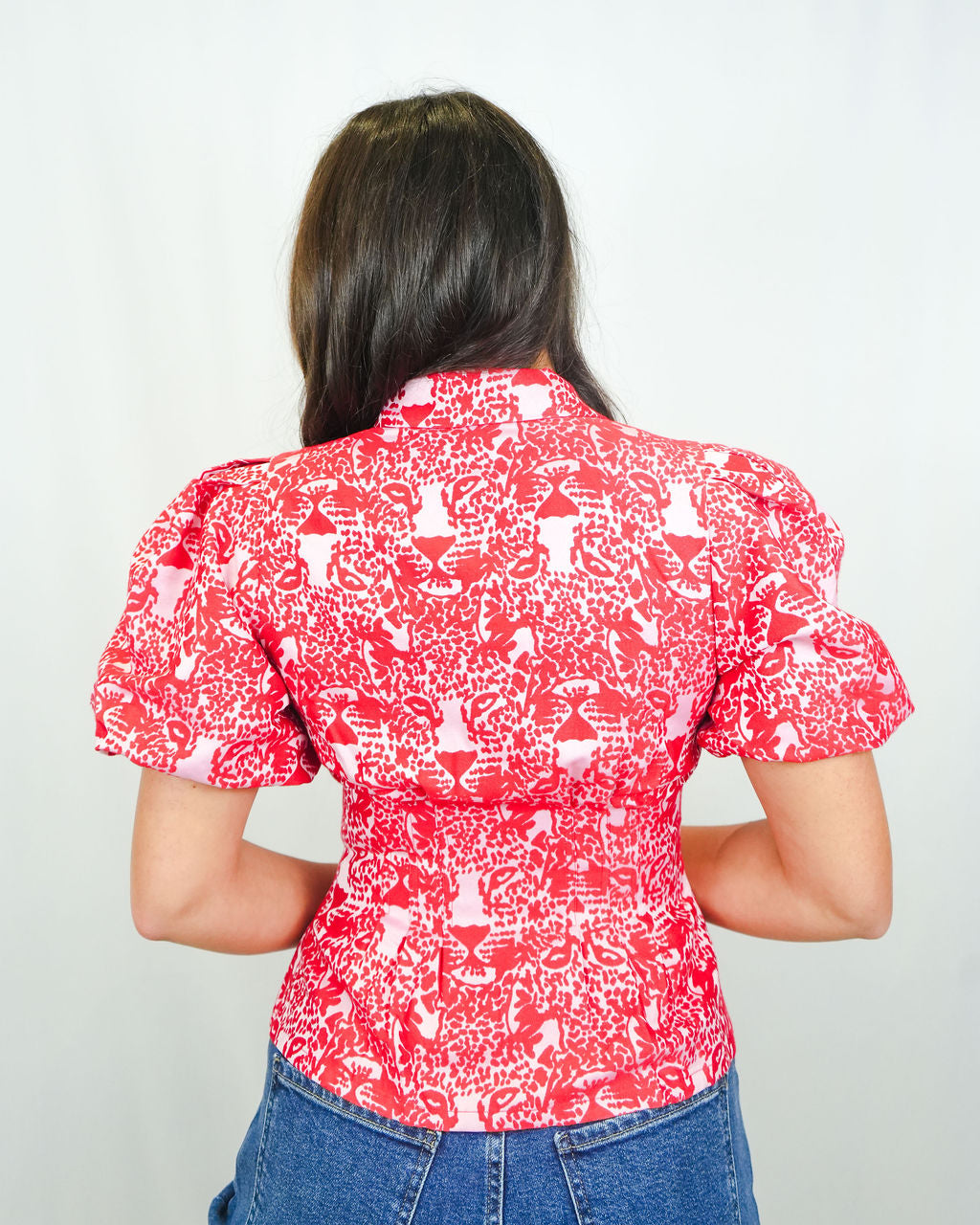 The Britt Top in Cheeky Cheetah features voluminous puff sleeves, a classic fold collar, button front with covered placket, lightly boned bodice, and a feminine peplum hem. The cheeky cheetah print showcases a feline face emerging through artful layering of texture and sheen. Woven into a sumptuous jacquard, the pattern gains depth and dimension, shifting playfully with the light for a bold yet elevated look. The perfect top to transition into the holiday season.