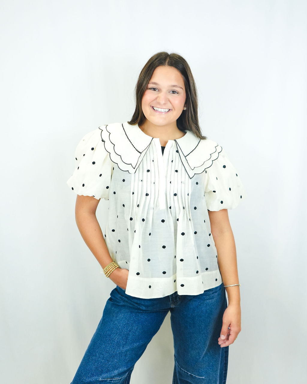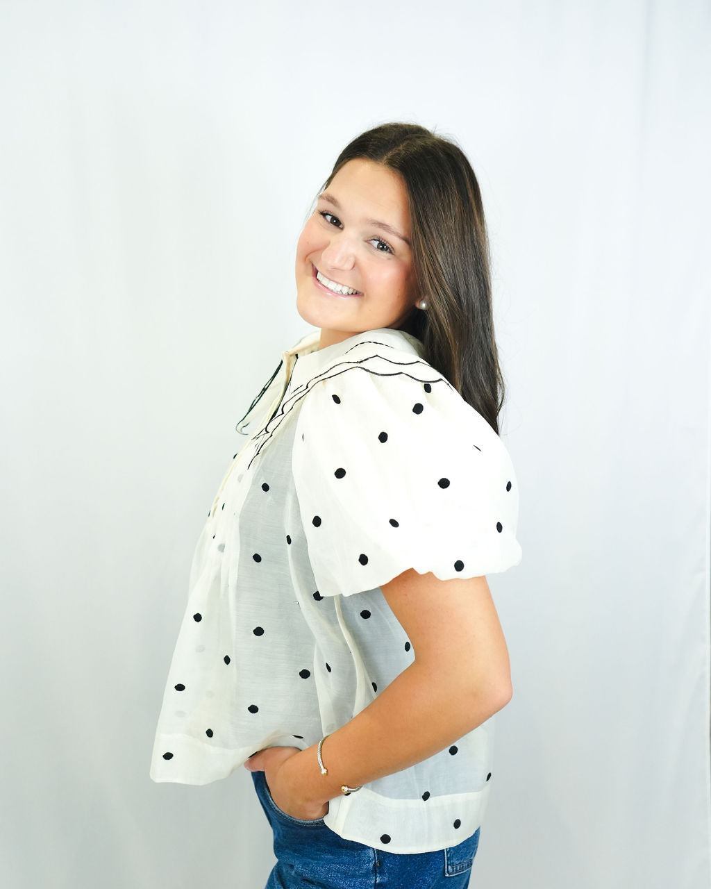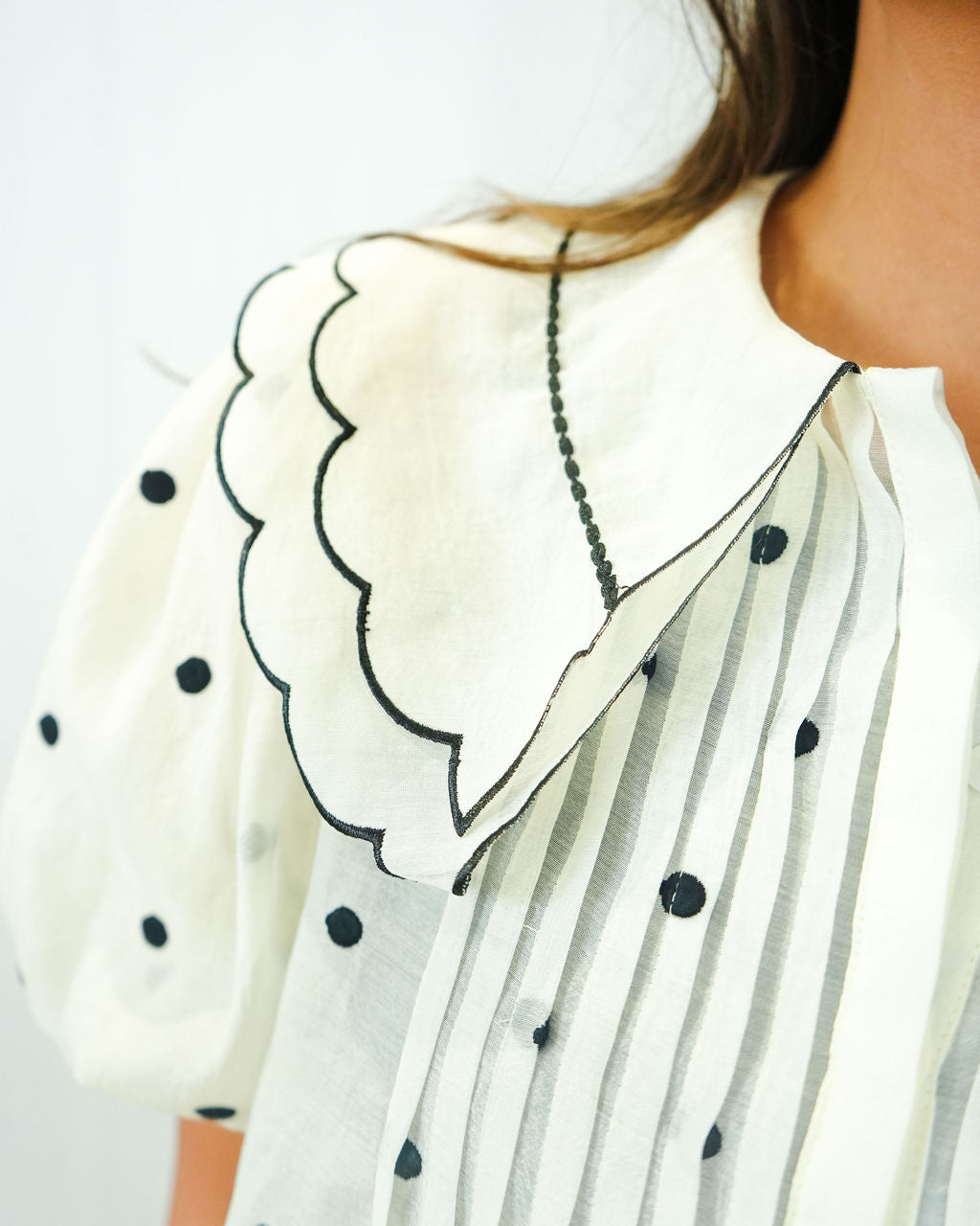 - Collar - Dot - Short puffed sleeves with elastic - Front placket with buttons - Relaxed fit - Chest tuck details