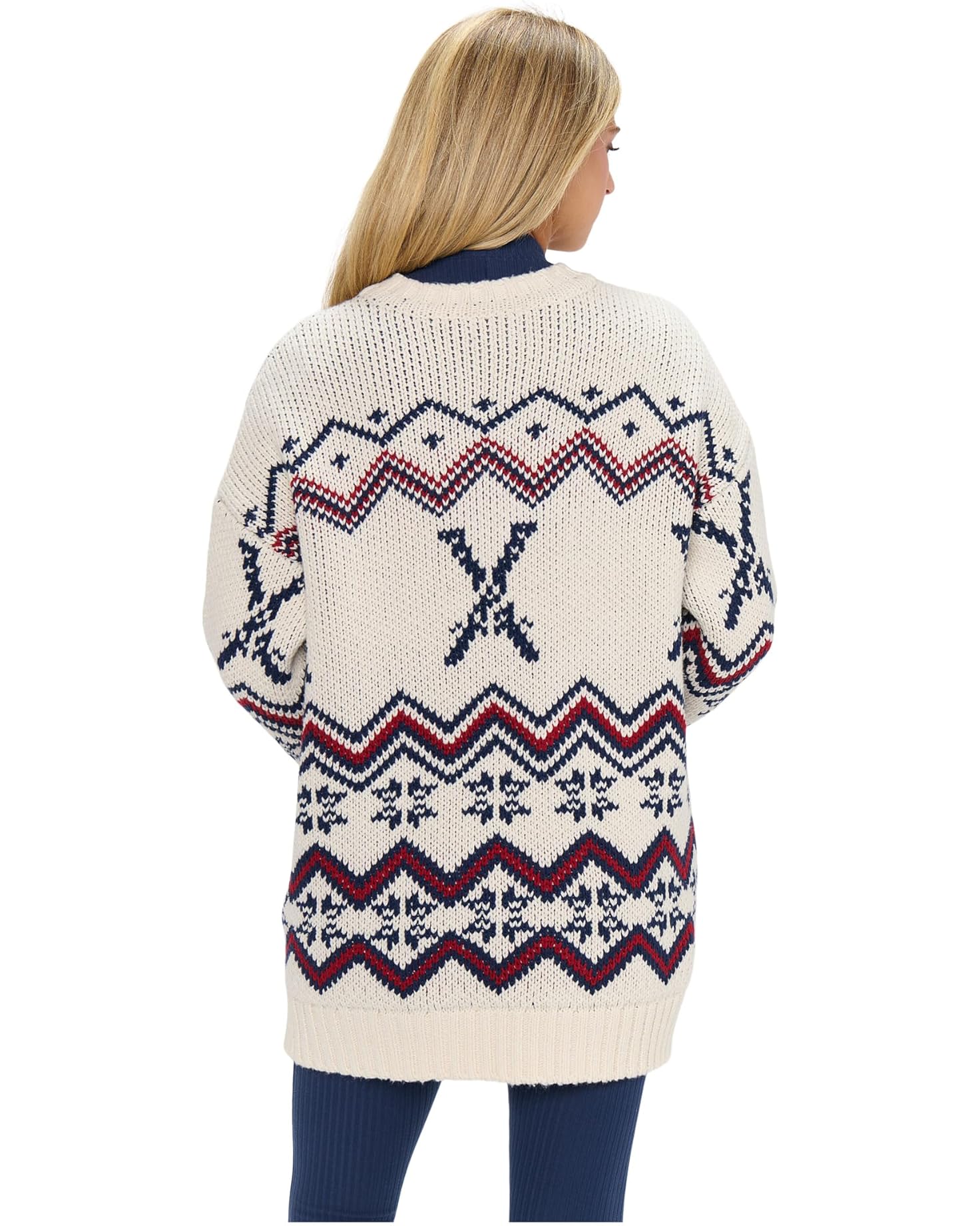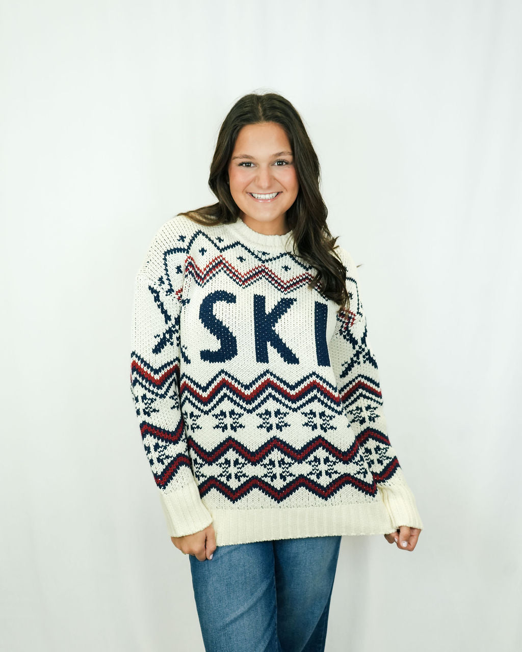 From chilly days to holidays, the Ski In Sweater is the perfect companion! This cozy oversized sweater features a long sleeve with color block cuffs, drop shoulders, and ribbed knit at the round neckline, sleeve cuffs, and hem. Get full on cozy with leggings and booties.