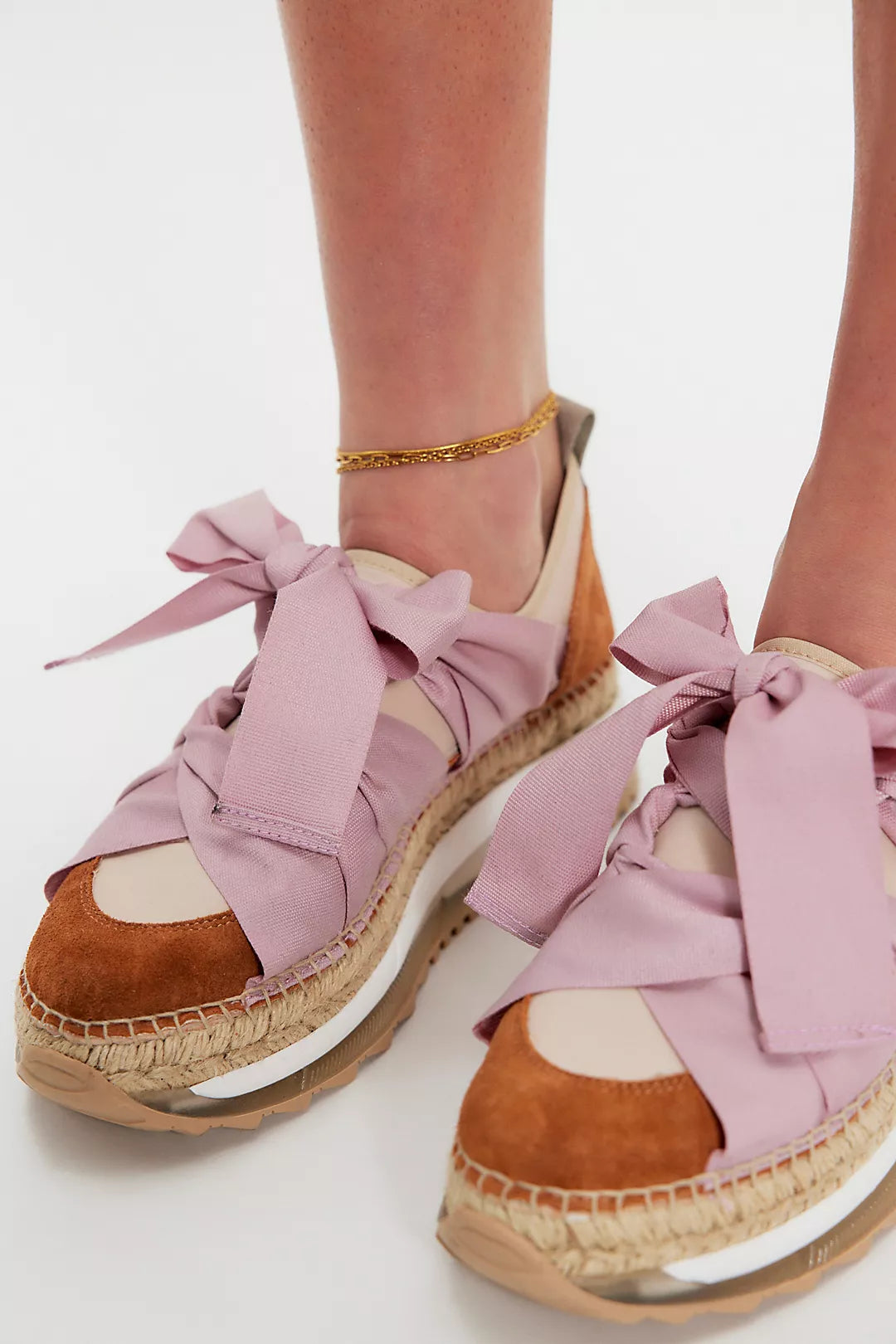 Elevate your style with these chic sneakers, featuring femme ribbon laces, classic suede overlays, and espadrille-inspired soles for an extra touch of texture.